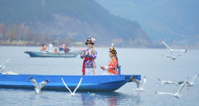 东谈主们在泸沽湖乘猪槽船与海鸥嬉戏 朱晓龙 摄