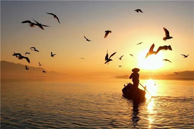 湖水、海鸥,还有划过的一叶小舟