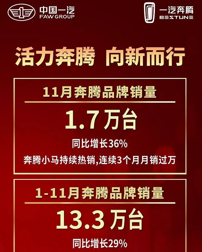 而本年,一汽旗下的奔腾品牌,在新能源车边界已获取不俗的收货。前11个月,其新能源车销量为7万辆,销售占比已达53%。其中,奔腾小马这款小型纯电车,号称“快意级爆款”,照旧流畅3个月销量过万了,有音信称在11月,小马的销量更是高达约13890台。
