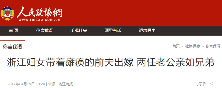 《浙江妇女带着瘫痪的前夫许配 两任老公亲如昆玉》钱江晚报,2017年4月19日发布