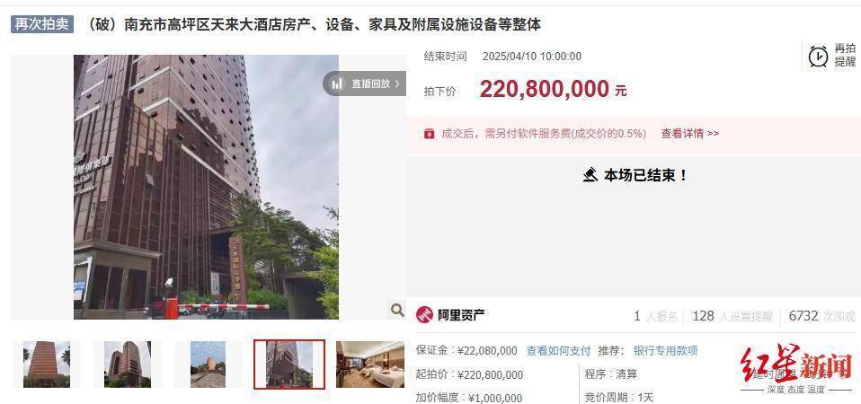 4月11日,微成齐从阿里钞票拍卖平台了解到,南充天来大旅馆及相干钞票的第十一次荟萃规矩拍卖最终以起拍价2.208亿元成交。