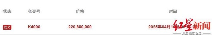该场拍卖取得了6732次围不雅,128东谈主配置教导,1东谈主报名。4月10日9点50分,唯独报名买家以底价2.208亿元拍下该钞票包。由于荟萃拍卖为匿名,现在尚不知买家身份。据辅拍机构责任主谈主员先容,待手续办结束就会公示买家书息。